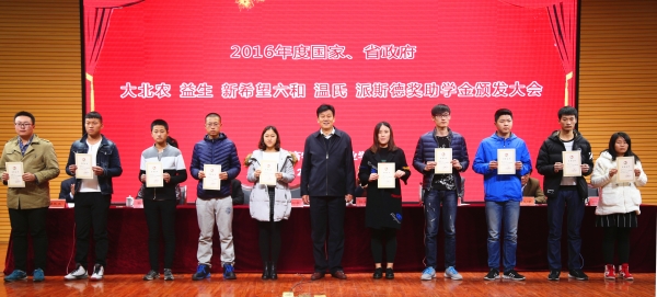 曲书记为获得奖助的学生颁发国家奖学金、国家励志奖学金、省政府奖学金、省政府励志奖学金和国家助学金。大北农集团、山东益生种畜禽股份有限公司、新希望六和集团、温氏集团等企业有关负责人为学生颁发企业奖助学金。