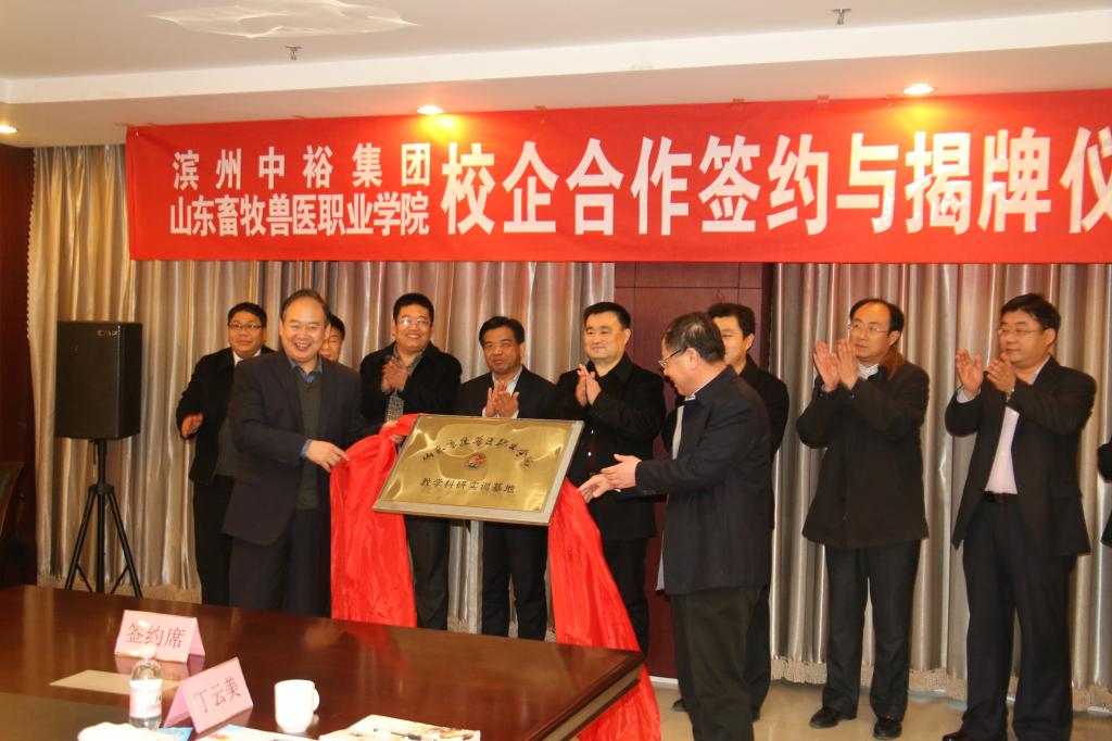 周其虎副院长在仪式上介绍了我院情况,分析了校企合作前景,提出了校企合作和教学科研实训基地建设思路。滨州市畜牧局、滨州市粮食局、滨城区畜牧局,教务与科研处、动物物科技系有关负责人参加仪式。滨州中裕集团是一家集种植、养殖、深加工于一体的大型股份制企业,综合经济指标连续多年在全国同行业中名列前茅,为山东省农业产业化重点龙头企业。(教务与科研处、动物科技系 供稿)