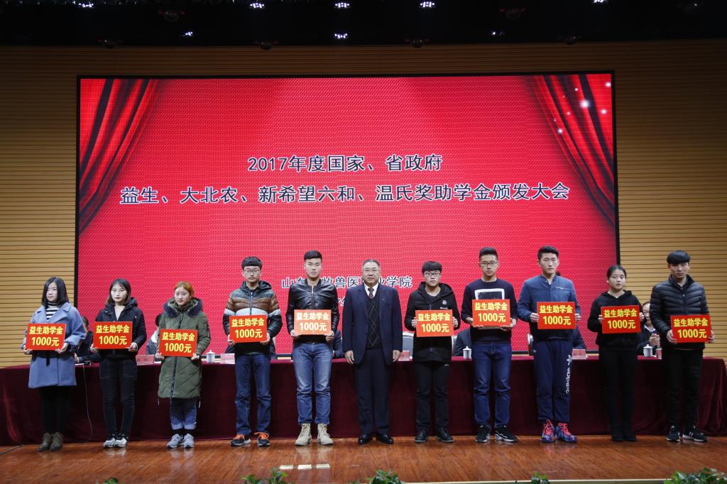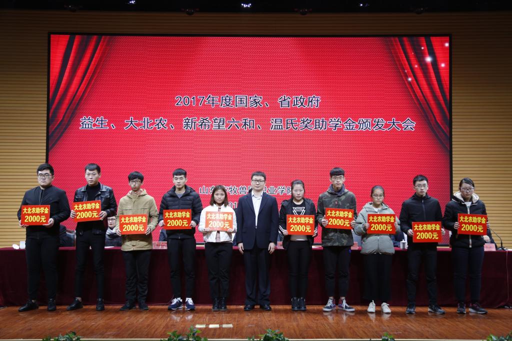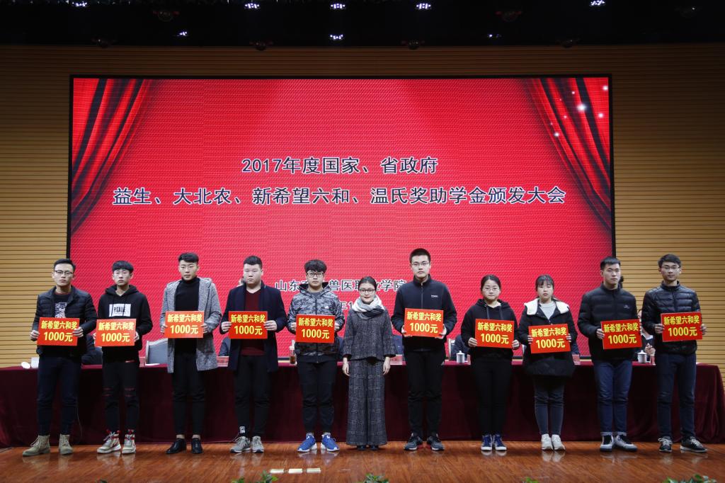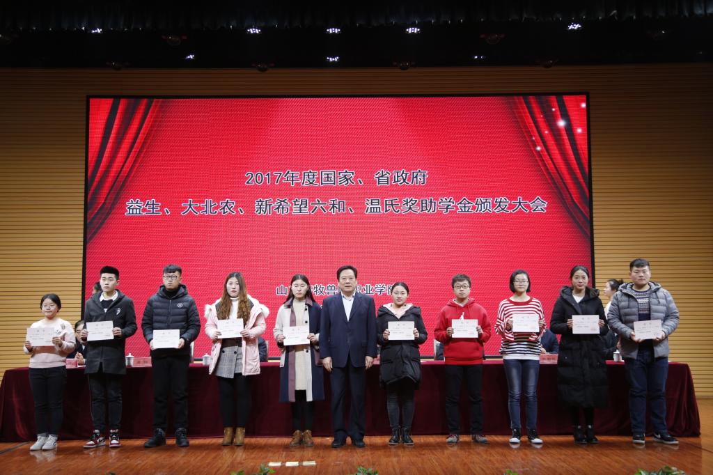 纪委书记乔立印宣读《关于表彰2016-2017学年奖学金获得者的决定》和《关于发放2017-2018学年助学金的决定》。郑立森书记为获奖助学生颁发国家奖学金、国家励志奖学金、省政府奖学金、省政府励志奖学金和国家助学金。山东益生种畜禽股份有限公司、大北农集团、新希望六和集团等企业有关负责人为学生颁发企业奖助学金。